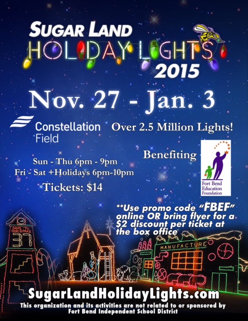 PDF Fort Bend Education Foundation Fundraise for The *For each promo code redeemed during the. 2021 Sugar Land Holiday Lights season, purchasers receive a discount off the day of event adult ticket price, and $2 is given back to the Fort Bend Education Foundation. T o p u r c h a s e t i c k e t s , v i s i t . S u g a r L a n d H o l i d a y L i g h t s . co m.